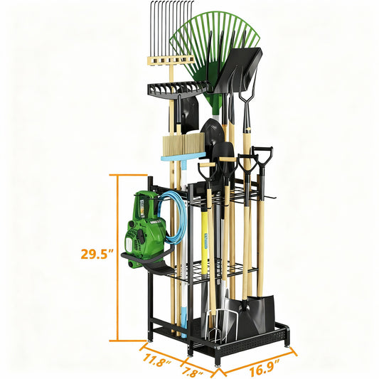 Heavy-Duty Garden Tool Organizer Rack for Garage & Yard – Metal Utility Storage Stand with Hooks for Rakes, Shovels, Brooms & Long-Handled Tools (Black)