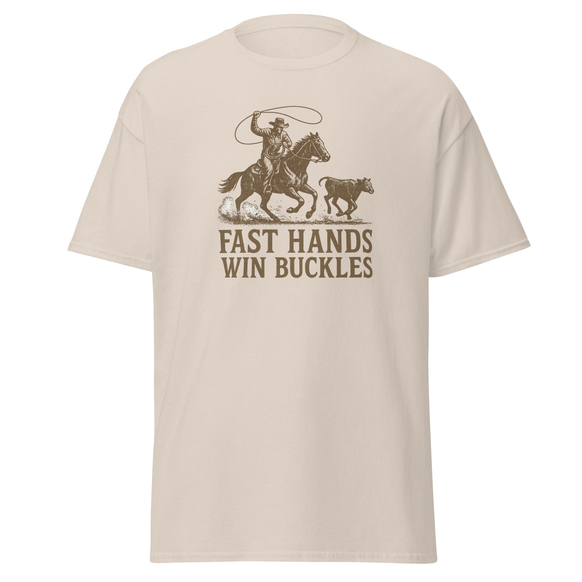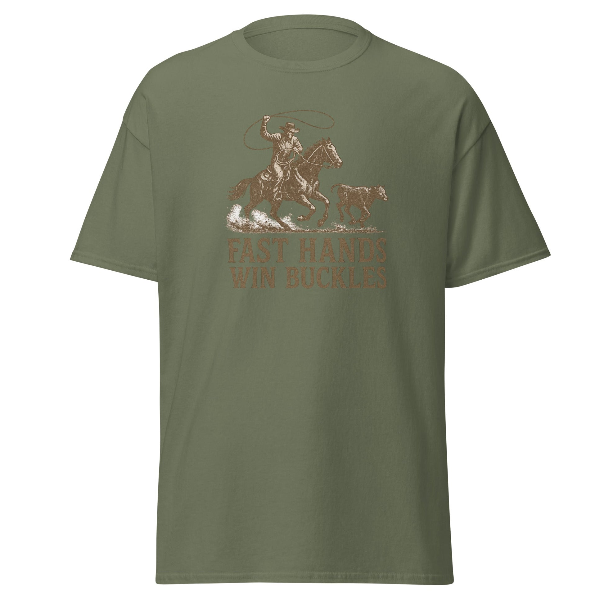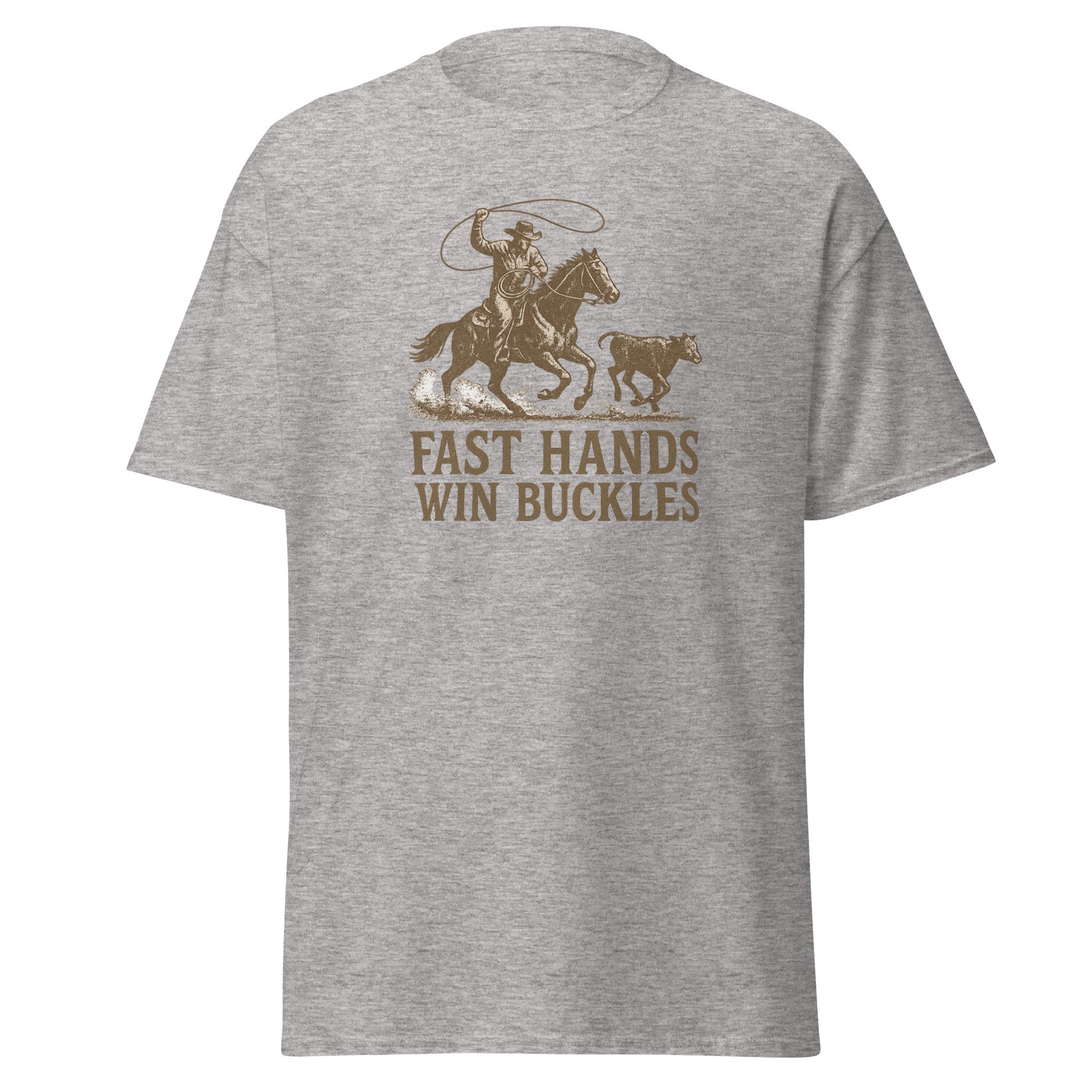 If you rope fast, ride hard, and live for the buckle, this one’s for you. The Fast Hands Win Buckles men’s graphic tee is made for rodeo junkies, ranch hands, and every cowboy who knows the difference between almost and all in.