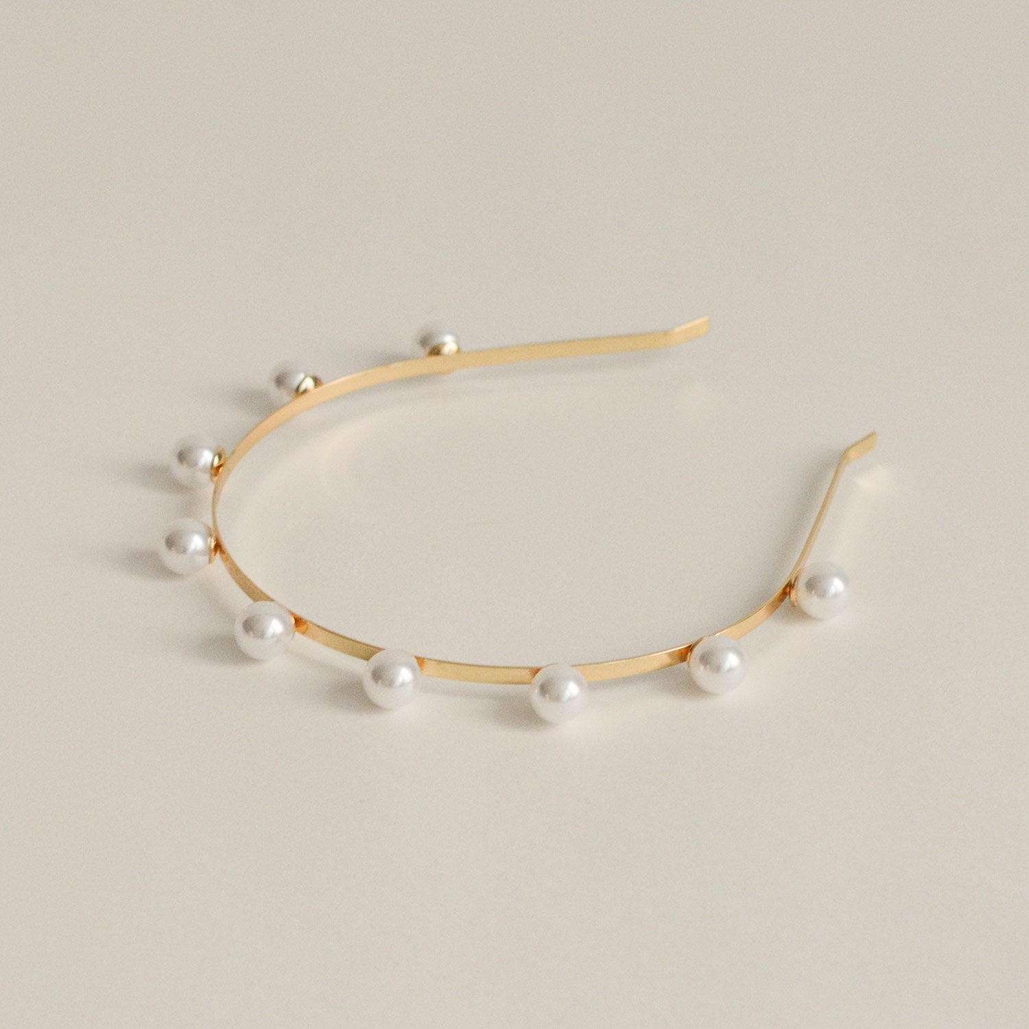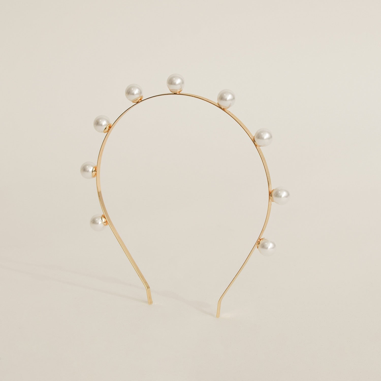 - Elegant headband featuring a metal base adorned with plastic pearls.