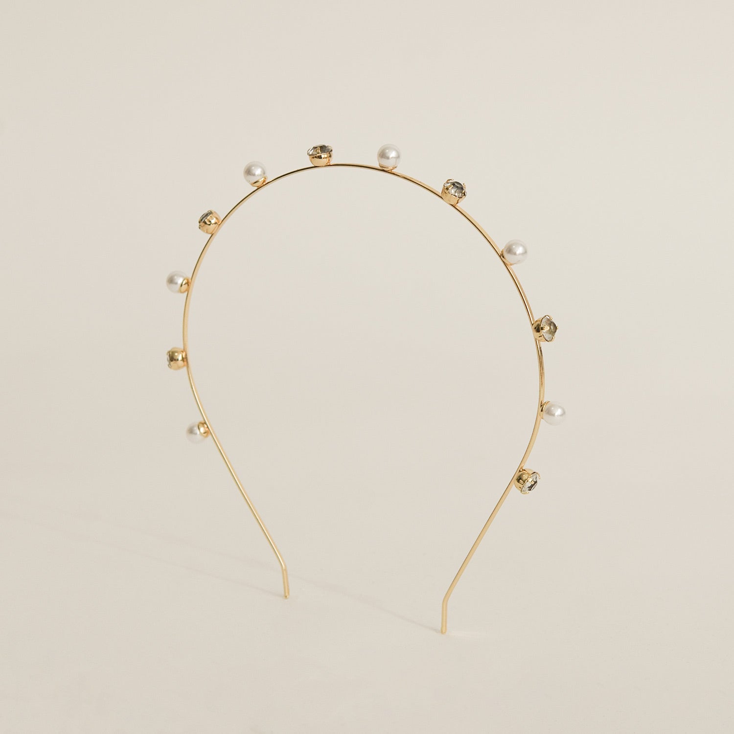 - Elegant headband featuring a metal base adorned with sparkling rhinestones and plastic pearls.