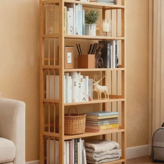 Made from durable, eco-friendly bamboo, this freestanding shelf offers strong stability, multiple tiers, and adjustable shelf heights—perfect for organizing books, décor, plants, or office supplies. Its narrow and vertical design saves floor space, making it ideal for apartments, offices, dorms, or any small room that needs stylish storage.