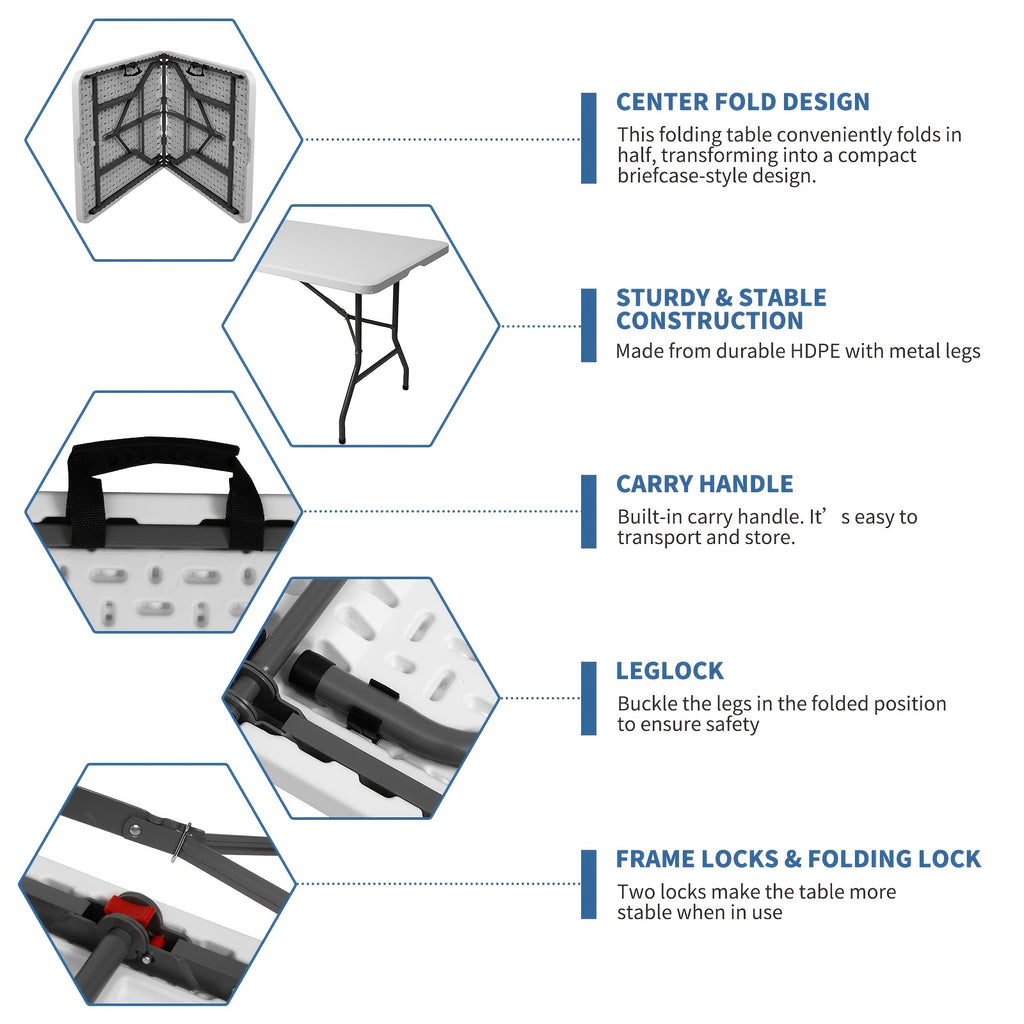 This versatile table features an easy foldable design with secure locking legs and a built-in carrying handle for effortless transport and storage. The high-density polyethylene (HDPE) tabletop resists stains and weather, while the sturdy steel frame supports a variety of uses with long-lasting durability.