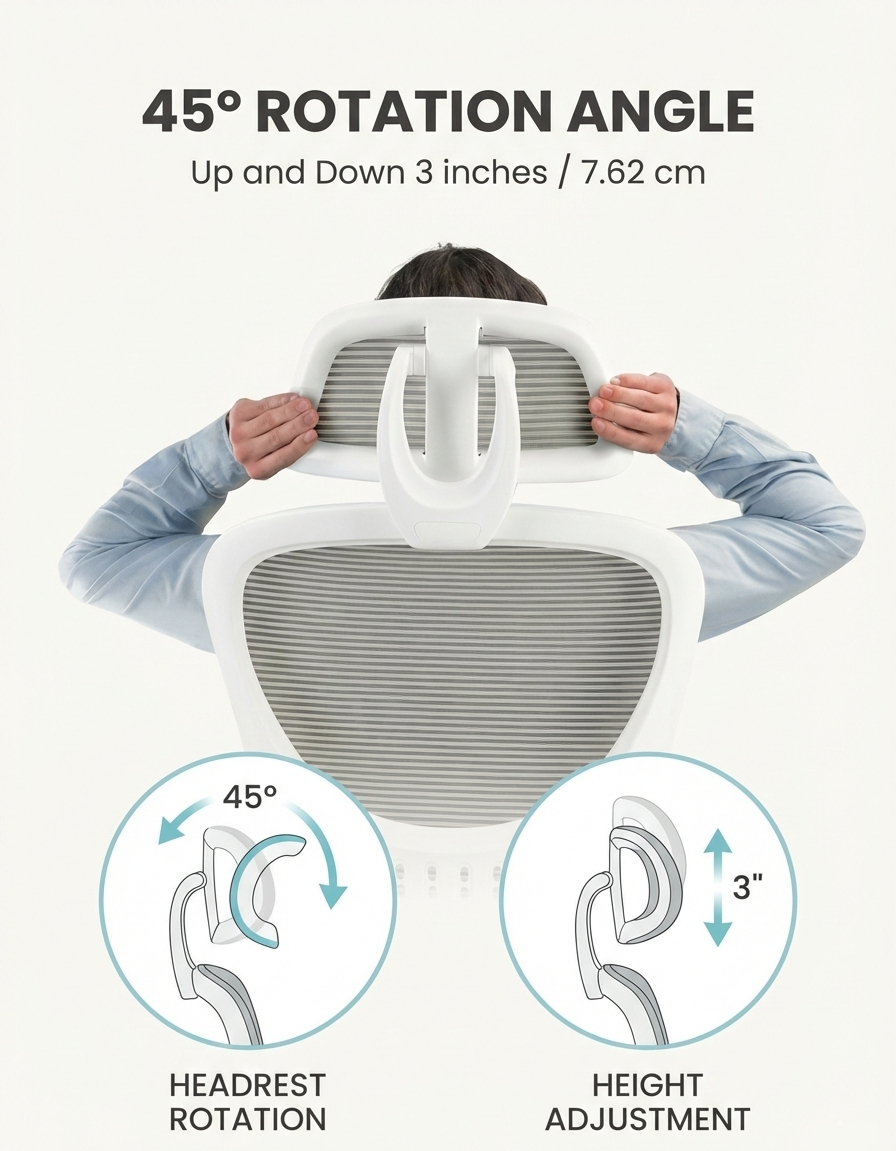 This chair features an adjustable headrest and built-in lumbar support, providing targeted support for your neck and lower back. The height-adjustable seat and smooth tilt function allow you to customize your sitting position for maximum comfort. Equipped with 360-degree rolling wheels, it moves effortlessly across most floor surfaces.